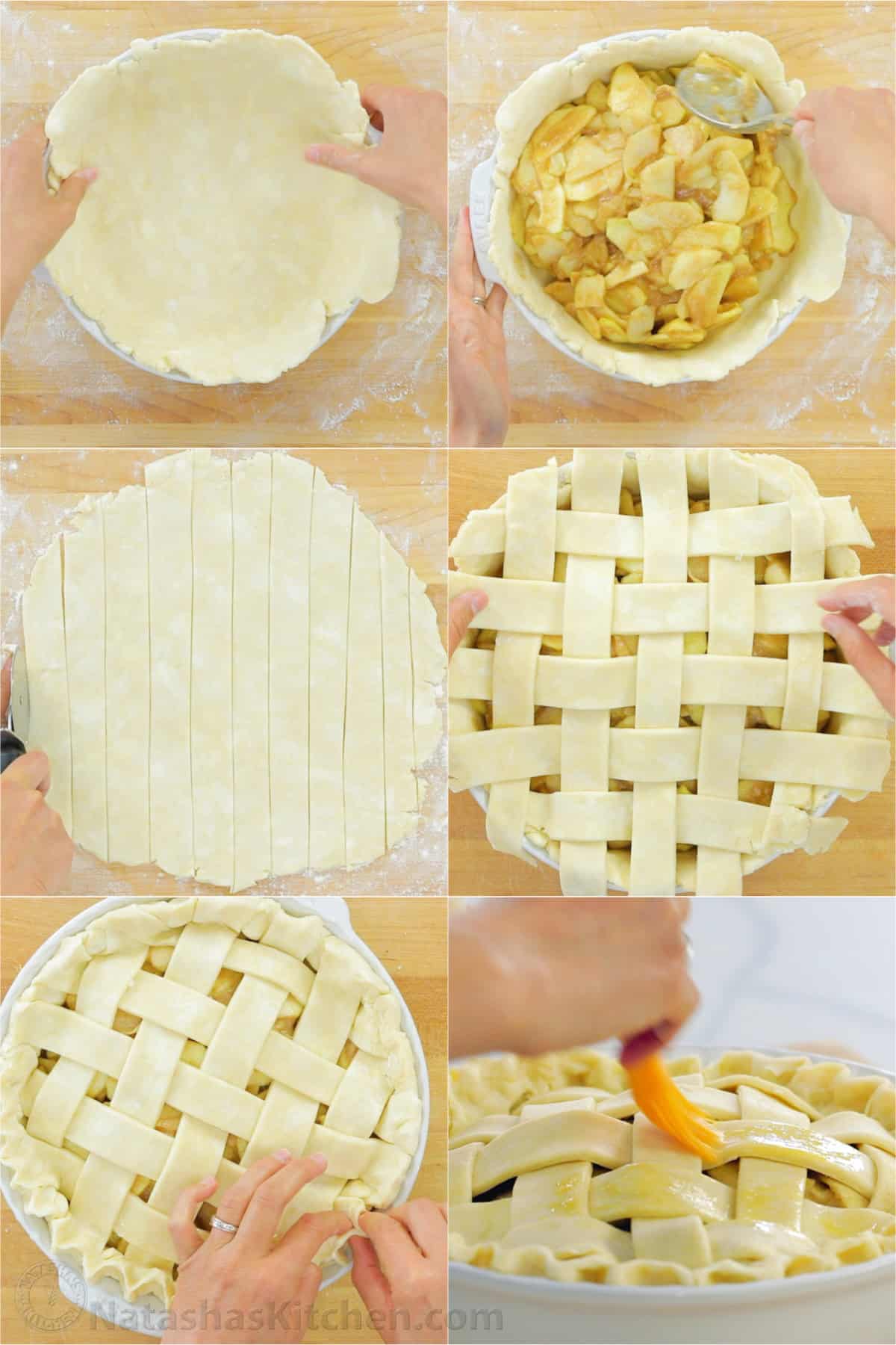 - Lattice Top – Roll the second disk into an 11-inch diameter circle and cut into 10 strips with a pizza cutter. Arrange half of the strips over the pie and weave in the second layer of strips (see how to make a lattice crust). Crimp the edges to seal and brush the crust with egg wash.