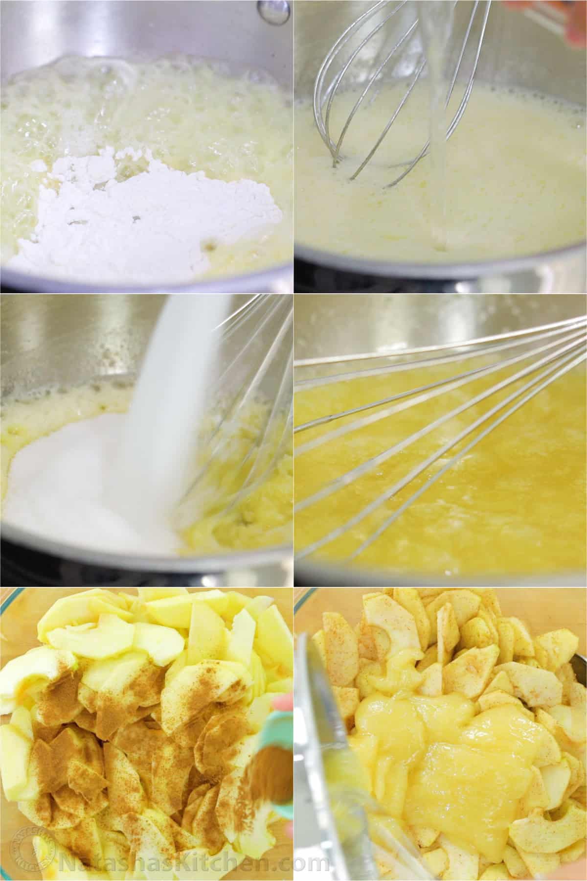 - Make the Filling – Melt butter in a medium saucepan over medium heat, add flour and whisk constantly for 1 minute. Whisk in water and sugar. Simmer for 3 minutes, then remove from heat. Do not overcook.